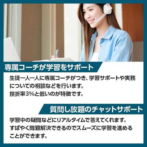 このように、専属コーチが、受講内容だけでなく、働き方など様々な相談に乗ってくれます。