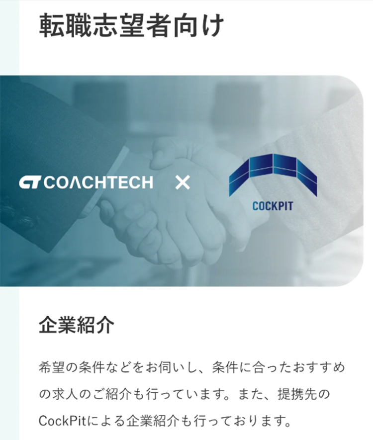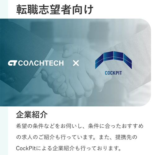 特に、転職希望者には、提携するCockPitによる企業紹介も行っています。