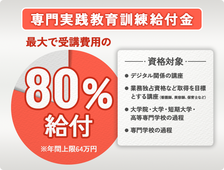 対象になっているコースを受講・終了した場合、支払った費用の最大80%(年間上限64万円)が給付される制度です。
