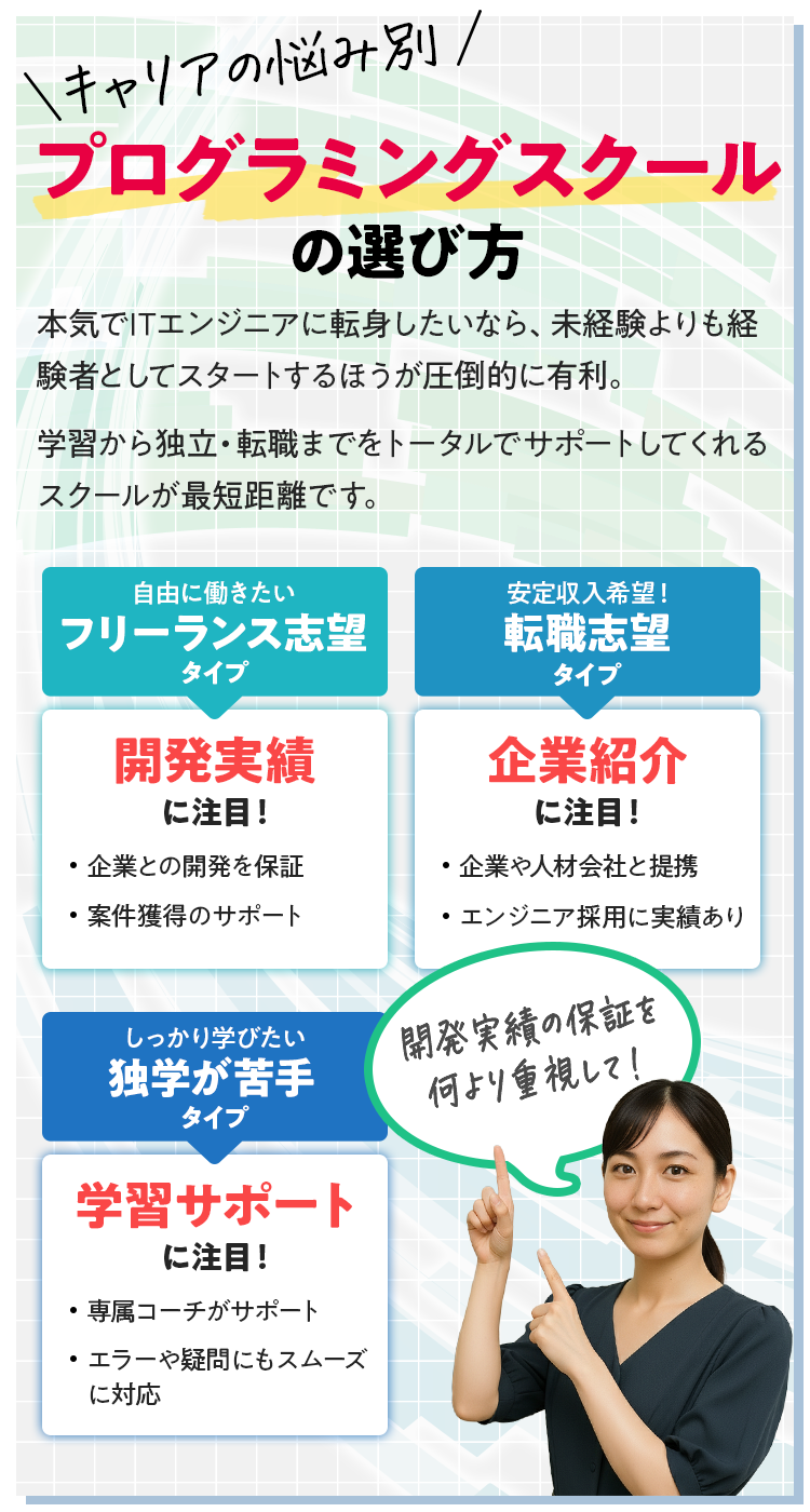 特に、開発案件を保証してくれるスクールを選ぶと、独立・転職までの道のりも明確に。